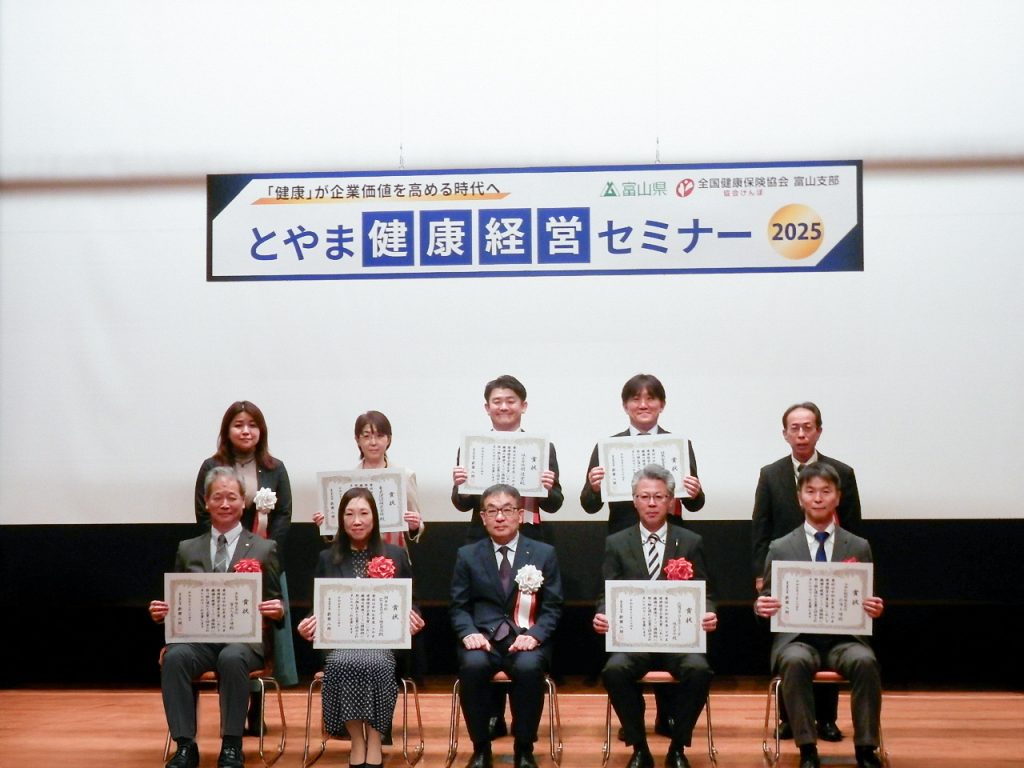 このたび、企業で働く従業員に向けた健康づくりに関して、特に先導的で、他の企業への横展開が期待される優れた取り組みを行う企業を表彰する「とやま健康経営企業大賞」(富山県主催)に選定いただきました。