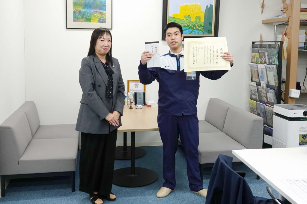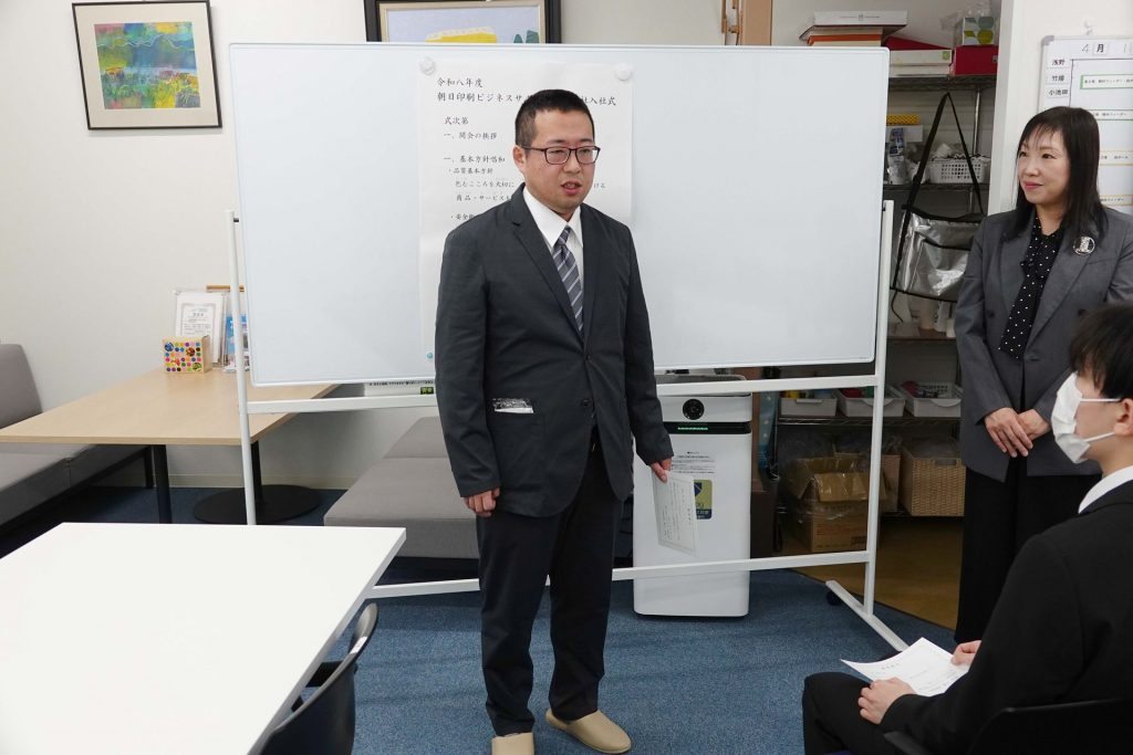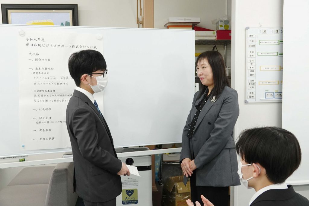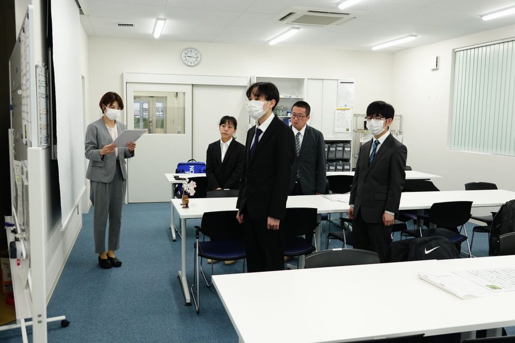 当日は、新入社員の紹介および永年勤続者の表彰を行い、その後、全員で記念撮影を実施しました。続いて行われた入社式では、辞令交付の後、新入社員一人ひとりが元気に抱負を述べ、その後オリエンテーションへと移りました。