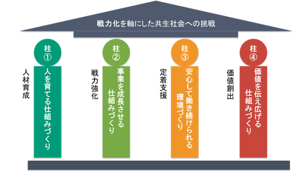 本計画は、厚生労働省が示す「障害者雇用の質の向上」の考え方を踏まえ、人材育成を起点に、ABSの持続的な成長とグループへの価値創出の実現を目指し、4つの柱で構成しています。